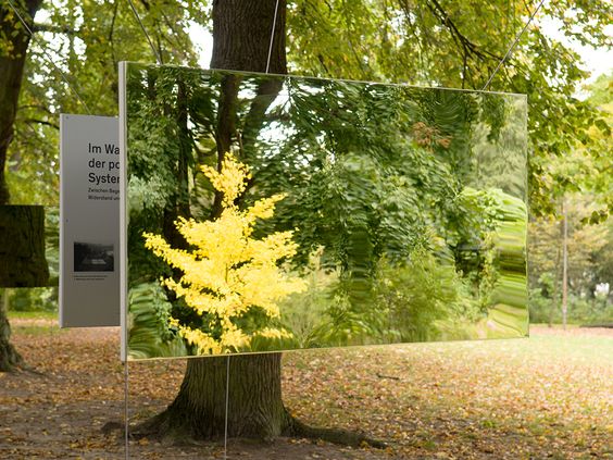 透明的鏡子標(biāo)識,與森林形成一體的設(shè)計風(fēng)